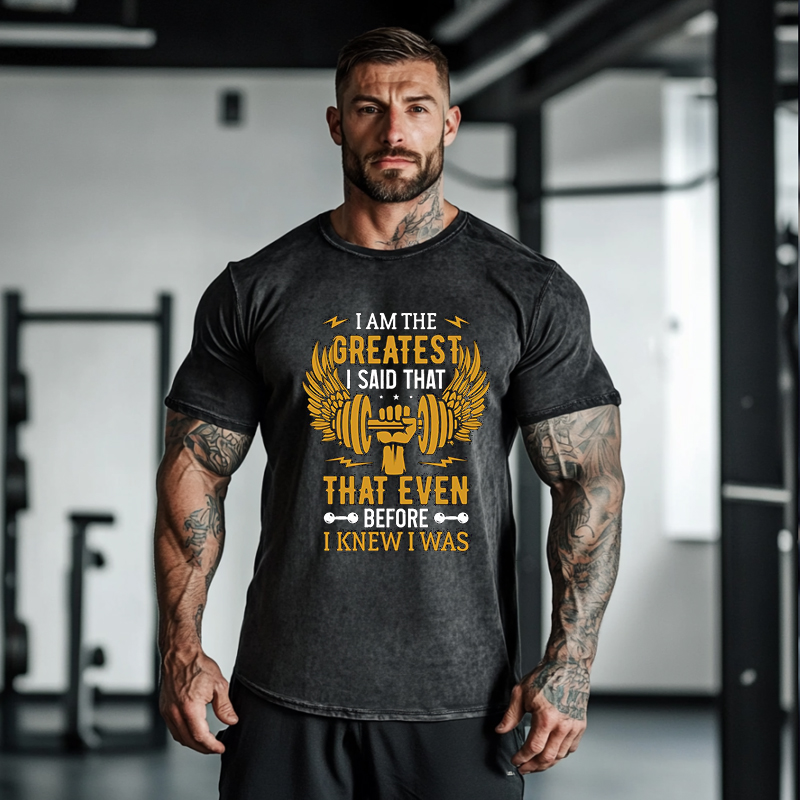 Give Me The Power Pattern Washed Short Sleeved Fitness Short Sleeved Shirt