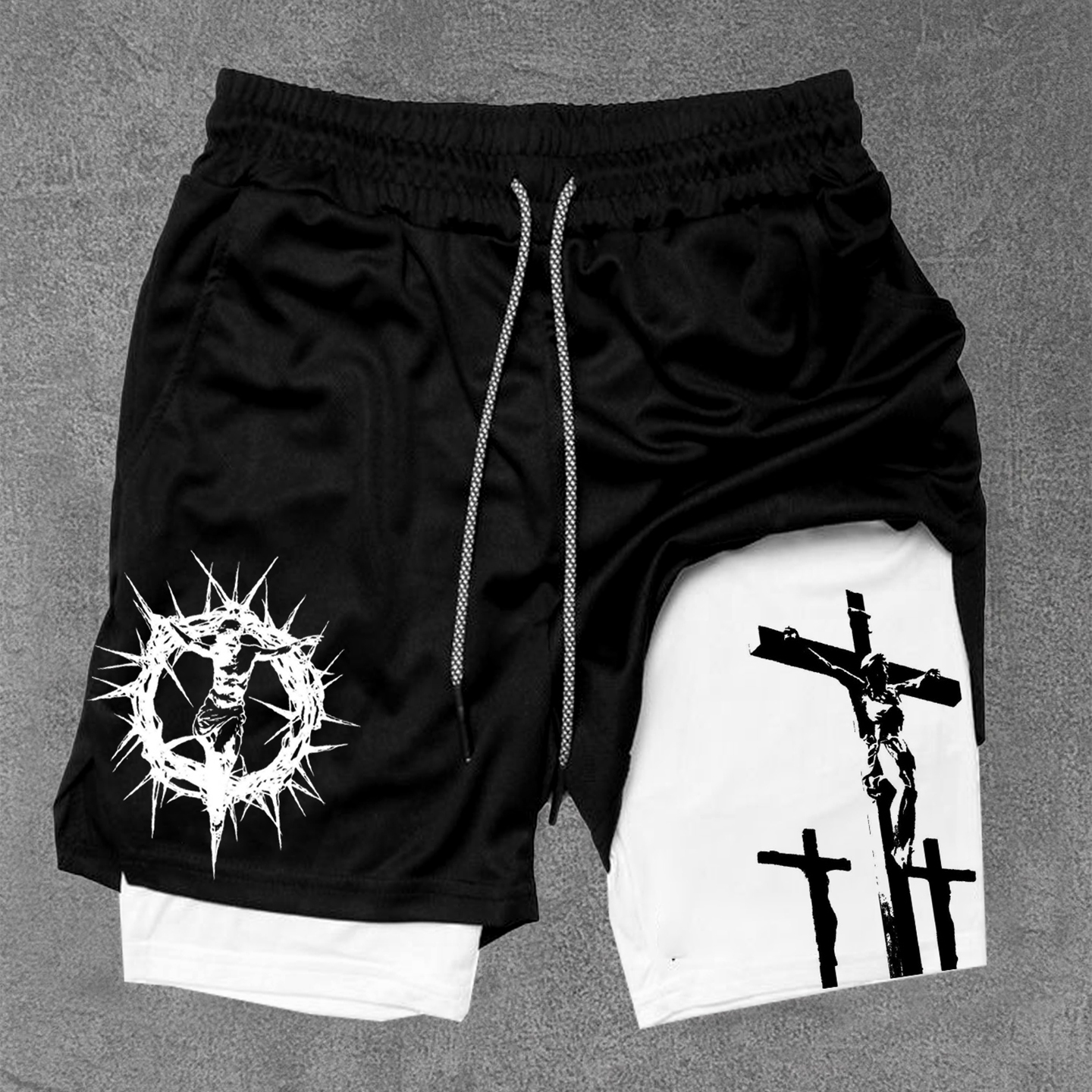 No Pain Jesus Graphics Double Layer Drawstring Gym Shorts