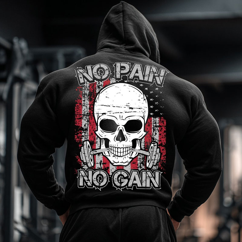Retro Gym No Pain No Gain Skull Graphic Cotton Pocket Hoodie