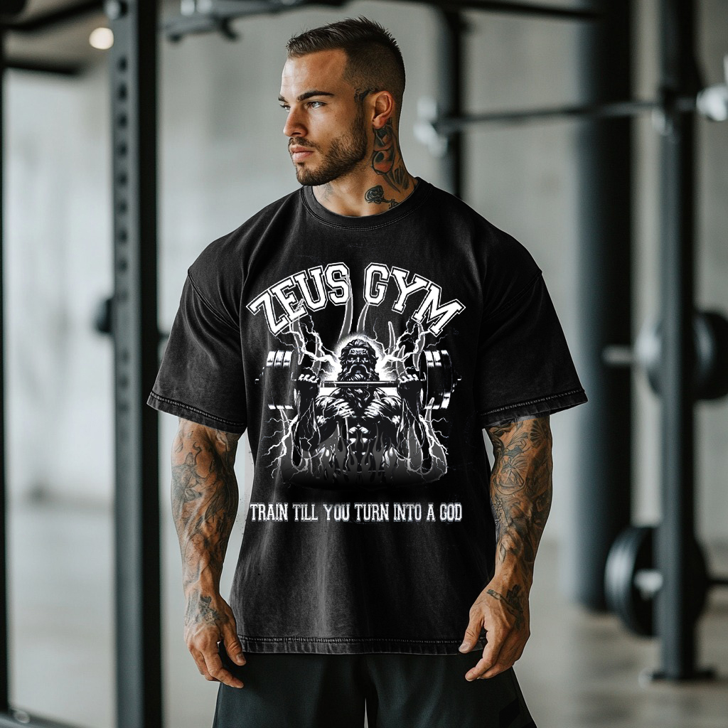 Retro Zeus Gym Flame God Graphics Washed T-shirt