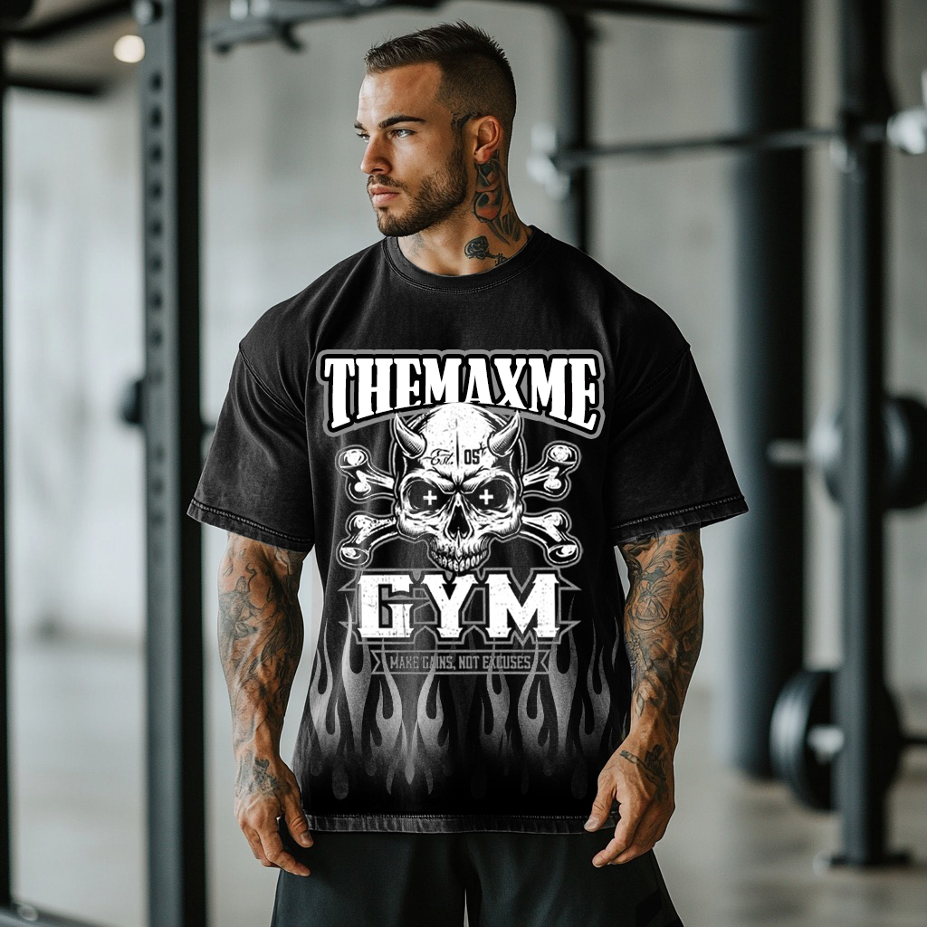 Themaxme Gym Skull Flame Graphic Washed Cotton T-shirt