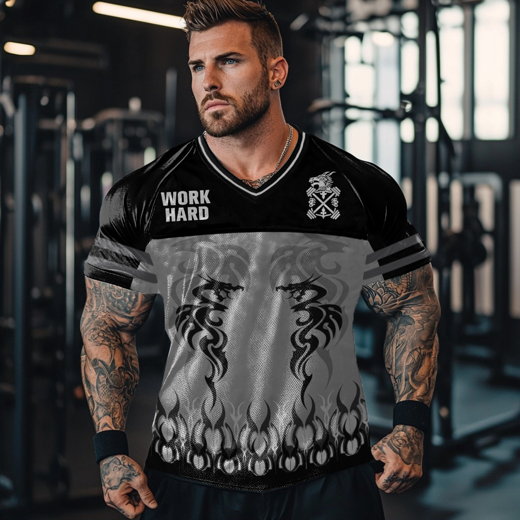 Work Hard Dragon Flame Graphics Gym Blokecore Blokette Jerseyfit V-neck T-shirt